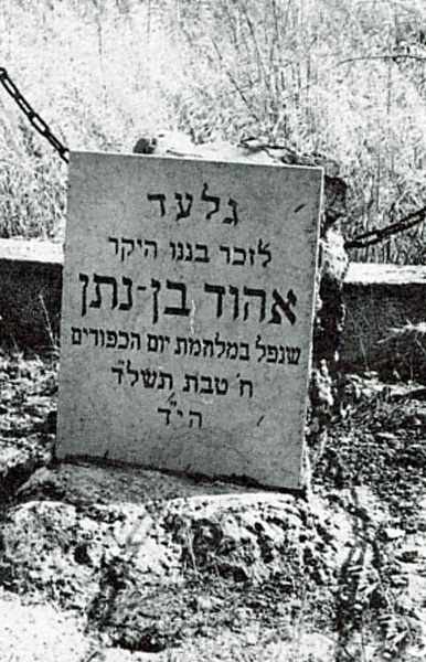 לוח שיש מרובע, הניצב על תלולית סלע בתוך רחבה מגודרת, הוא "גלעד לזכר בננו היקר אהוד בן-נתן, שנפל במלחמת יום הכיפורים, ח' טבת תשל"ד. הי"ד".